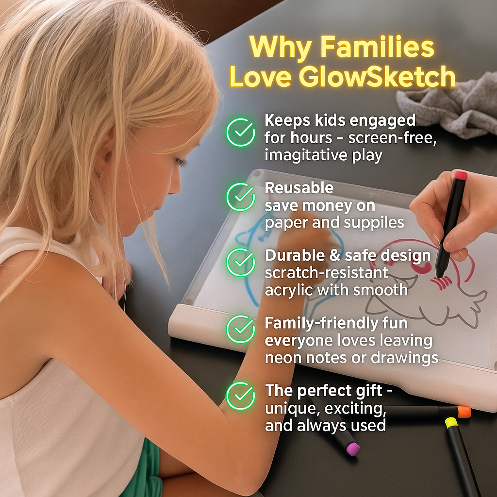 GlowSketch is loved by kids, parents, teens, and even adults. Use it for doodles, tracing, handwriting practice, glowing messages, or as a fun neon sign for your home or business.