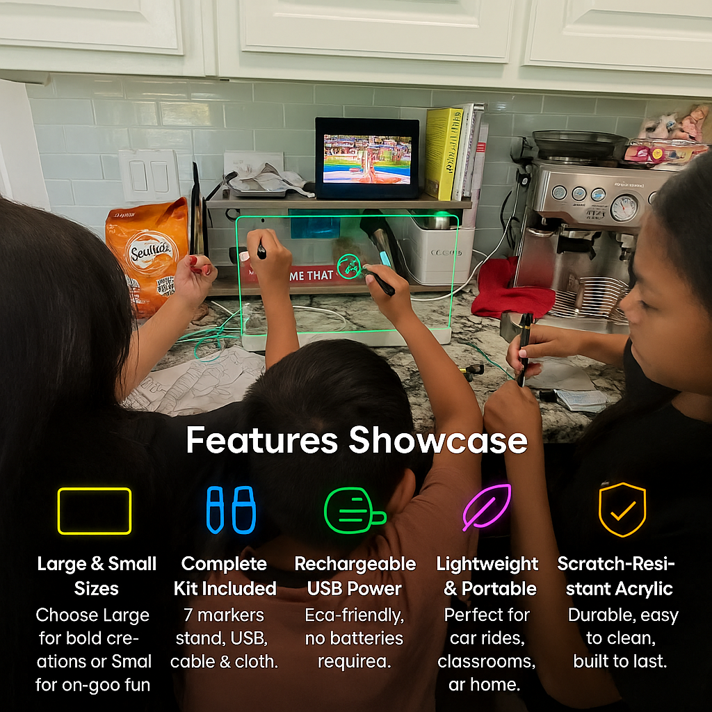 The rechargeable LED glow board that transforms art, notes, and doodles into neon masterpieces.